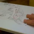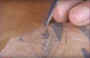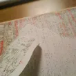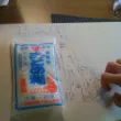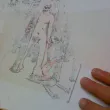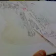 - décollage: appliquer un peu d'eau avec une éponge / chiffon un peu humidifié (pas trop). Laisser l'eau pénétrer un peu les premières couches du papier, et essayer de décoller en roulant le papier dont n'enlève en fait que les premières couches. On trouve en général un endroit ou cela marche bien, une profondeur qui est bonne (entre ne pas assez enlever de papier et trop en enlever, avec le dessin). Si on n'y arrive pas d'un coté, essayer d'un autre, ou humidifier encore un peu. La feuille ne doit jamais être humidifiée au point d'être