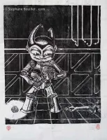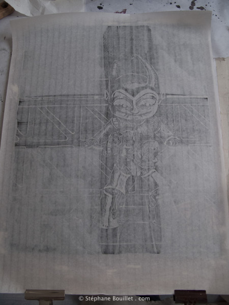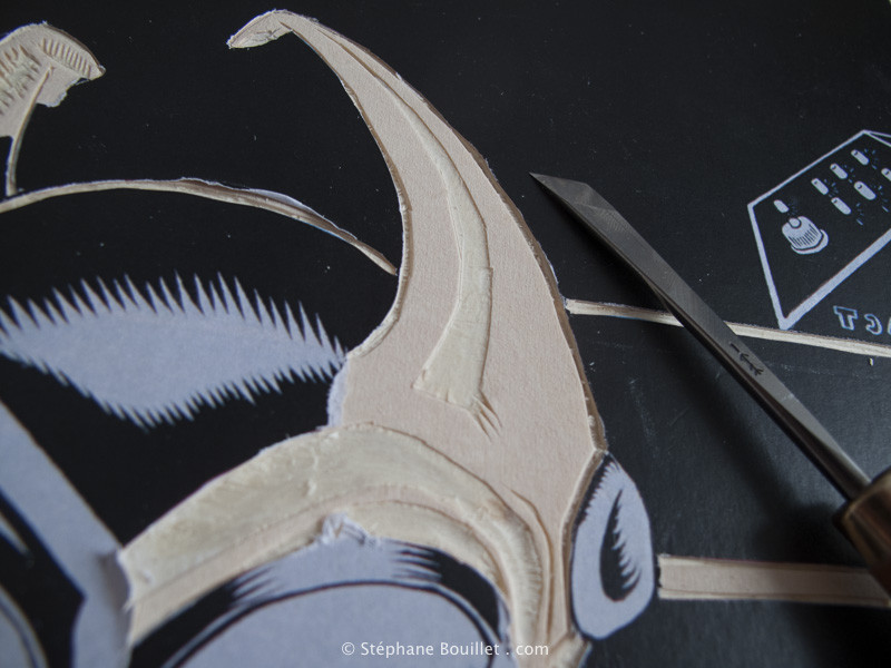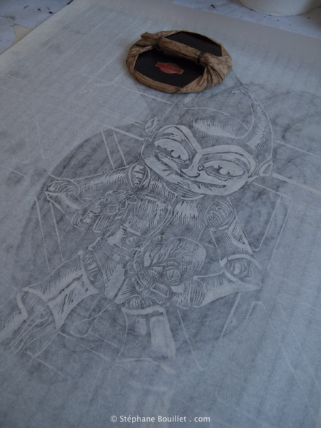 La méthode traditionnelle japonaise a ici été ± reproduite: collage de l'image peinte à l'envers (pour l'Astro, j'avais déjà fait un vrai dessin sur papier 300g, j'ai juste imprimé une copie inversée, un peu plus grande que l'original, que j'ai collé à l'endroit, car pas assez transparent). Puis on grave directement en découpant l'image d'origine qui sera donc détruite.