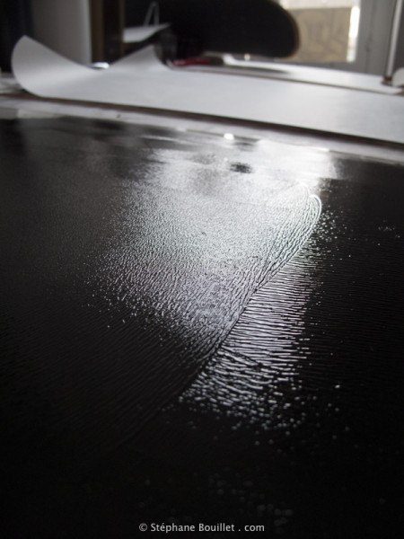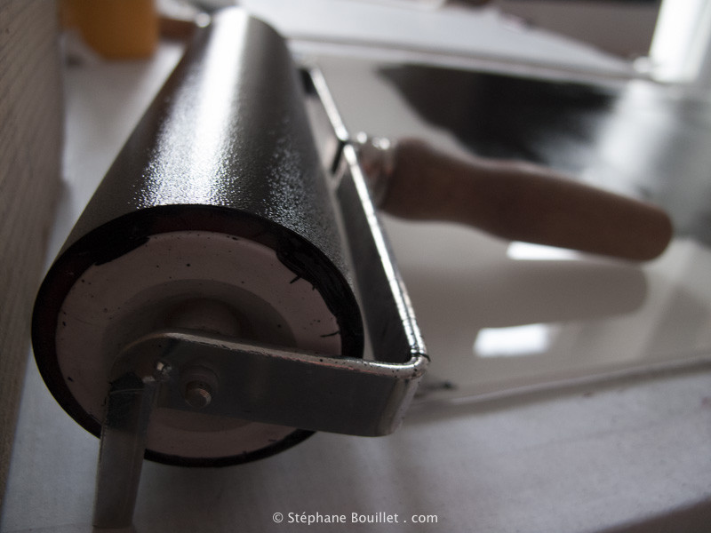 Le rouleau encreur: après avoir déposé l'encre à l'eau sur une plaque de verre (planéité, nettoyage facile), on la répartit rapidement avec une spatule, et on la chauffe /répartit en faisant des va-et-vient (ou juste des vient), jusqu'à entendre un "freuchttt-freuchttt" caractéristique indiquant la bonne quantité d'encre. Tout cela pour homogénéiser la quantité d'encre sur la plaque de verre, et donc sur le rouleau, et donc sur la gravure.