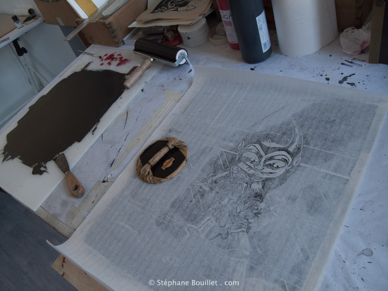 • sur du papier tellement fin que l'on voit à travers l'encre adhérer au papier, ce qui permet de voir l'évolution (parties mal imprimées) et d'insister sur certaines parties et donc de nuancer les tons