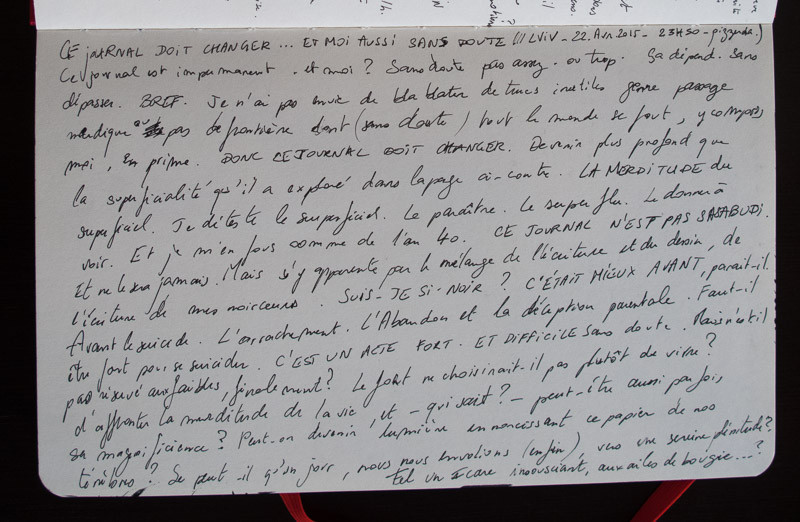 Sketchbook analytique. Association de textes et de dessins les illustrant. ± 1 texte et 1 dessin par jour Ou comment noircir le papier pour blanchir son âme, jeter mots et maux pour s'alléger le cœur, le corps, la tête et l'esprit. NB: ni le texte ni les dessins n'ont vocation à être des chefs-d'œuvre ou des prouesses techniques ou lyriques. C'est juste une méthode de progression.