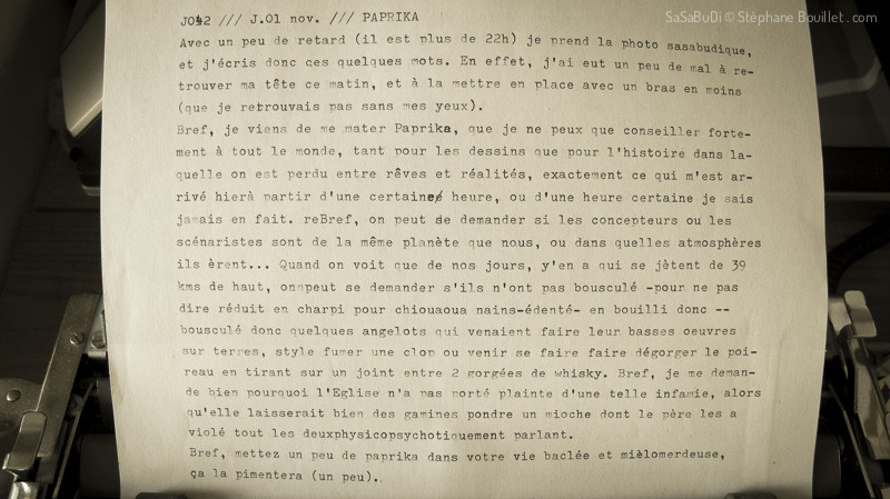 Bref, je viens de me mater Paprika, que je ne peux que conseiller fortement à tout le monde,tant pour les dessins que pour l'hisoire dans laquelle on est perdu entre rêves et réalités, exactement ce qui m'est arrivé hier à partir d'une cetaine heure, ou d'une heure certaine je sais jamais en fait. ReBref, on peut se demander si les concepteurs ou les scénaristes sont de la même planète que nous, ou dans quelles atmosphères ils èrent... Quand on voit que de nos jours, y'en a qui se jètent de 39 kms de haut, on peut se demander s'ils n'ont pas bousculé -pour ne pas dire réduit en charpi pour chiouaouas nains-édentés- en bouillie donc-- bousculé donc quelques angelots qui venaient faire leurs basses oeuvres sur terre, style fumer une clop ou venir se faire dégorger le poireau en tirant sur un joint entre 2 gorgées de whisky. Bref je me demande bien pourquoi l'Église n'a pas porté plainte d'une telle infamie alors qu'elle laisserait bien des gamines pondre un mioche ont le père les a violés tous les deux physicopsychotiquement parlant.