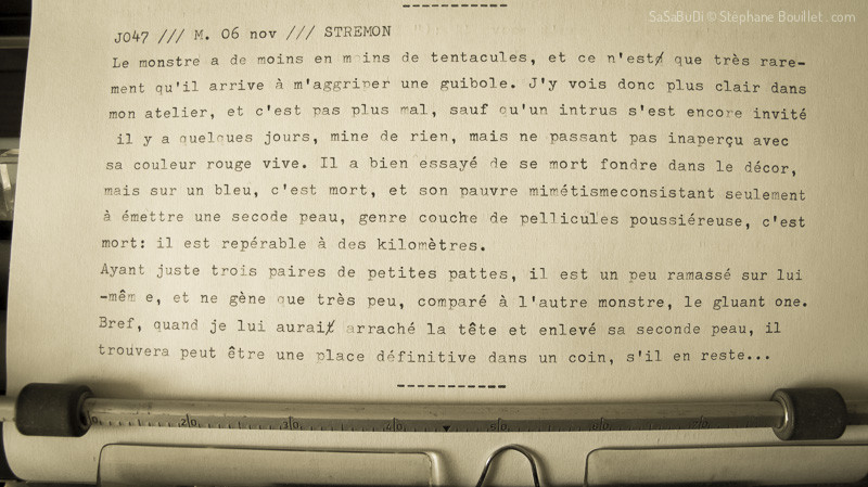 Le monstre a de moins en moins de tentacules, et ce n'est que très rarement qu'il arrive à m'aggriper une guibole. J'y vois donc plus clair dans mon atelier, et c'est pas plus mal, sauf qu'un intrus s'est encore invité il y a quelques jours, mine de rien, mais ne passant pas inaperçu avec sa couleur rouge vive. Il a bien essayé de se mort fondre dans le décor, mais sur un bleu, c'est mort, et son pauvre mimétisme consistant seulement à émetttre une seconde peau, genre couche de pellicules poussiéreuse, c'est mort: il est repérable à des kilomètres.