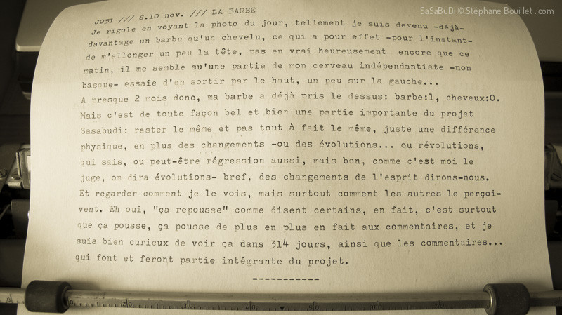 Je rigole en voyant la photo du jour, tellement je suis devenu -déjà- davantage un barbu qu'un chevelu, ce qui a pour effet -pour l'instant- de m'allonger un peu la tête , pas en vrai heureusement, encore que ce matin, il me semble qu'une partie de mon cerveau indépendantiste -non basque- essaie d'en sortir par le haut, un peu sur la gauche... A presque 2 mois donc, ma barbe a déjà pris le dessus: barbe:1, cheveux:0. Mais c'est de toute façon bel et bien une partie importante du projet Sasabudi: rester le même et pas tout à fait le même, juste une différence physique, en plus des changements -ou des évolutions... ou révolutions, qui sais, ou peut-être régression aussi, mais bon, comme c'est moi le juge, on dira évolutions- bref, des changements de l'esprit dirons-nous. Et regarder comment je le vois, mais surtout comment les autres le perçoivent. Eh oui, "ça repousse" comme disent certains, en fait, c'est surtout que ça pousse, ça pousse de plus en plus en fait aux commentaires, et je suis bien curieux de voir ça dans 314 jours, ainsi que les commentaires... qui font et feront partie intégrante du projet.