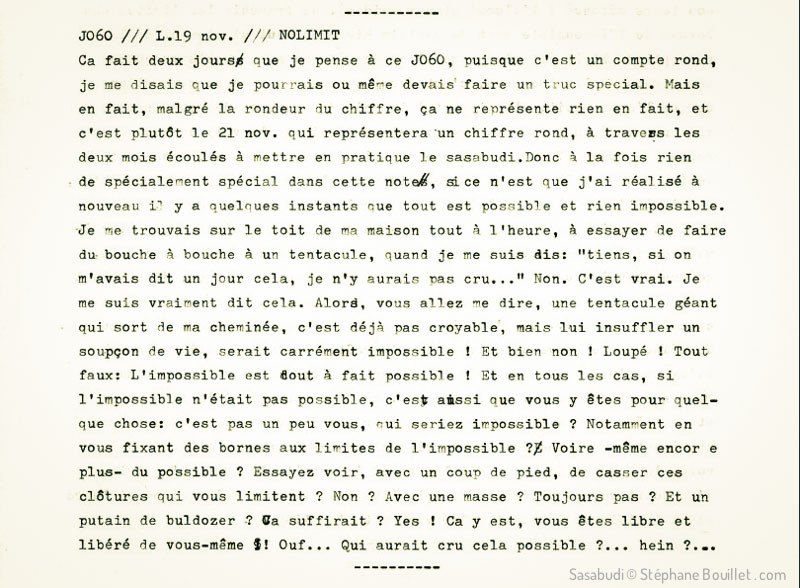 Ca fait deux jours que je pense à ce J060, puisque c'est un compte rond, je me disais que je pourrais ou même devais faire un truc special. Mais en fait, malgré la rondeur du chiffre, ça ne représente rien en fai t, et c'est plutôt le 21 nov. qui représentera un chiffre rond, à travers les deux mois écoulés à mettre en pratique le sasabudi. Donc à la fois rien de spécialement spécial dans cette note, si ce n'est que j'ai réalisé à nouveau il y a quelques instants que tout est possible et rien impossible. Je me trouvais sur le toit de ma maison tout à l'heure, à essayer de faire du bouche à bouche à un tentacule , quand je me suis dis: "tiens , si on m'avait dit un jour cela, je n'y aurais pas cru..." Non. C'est vrai. Je me suis vraiment dit cela. Alors, vous allez me dire, une tentacule géant qui sort de ma cheminée, c'est déjà pas croyable, mais lui insuffler un soupçon de vie, serait carrément impossible ! Et bien non ! Loupé ! Tout faux : l'impossible est tout à fait possible ! Et en tous les cas, si l'impossible n'était pas possible, c'est aussi que vous y êtes pour quelque chose: c'est pas un peu vous, qui seriez impossible ? Notamment en vous fixant des bornes aux limites de l'impossible ? Voire -même encore plus- du possible ? Essayez voir , avec un coup de pied, de casser ces clôtures qui vous limitent ? Non ? Avec une masse ? Toujours pas ? Et un putain de bulldozer ? Ça suffirait ? Yes ! Ca y est, vous êtes libre et libéré de vous-même ! Ouf... Qui aurait cru cela possible ?... hein ?...