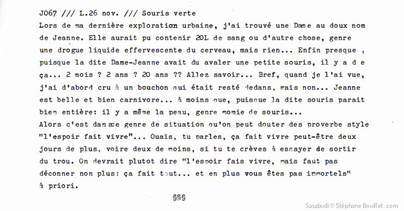 Lors de ma dernière exploration urbaine, j'ai trouvé une Dame au doux nom de Jeanne. Elle aurait pu contenir 20L de sang ou d'autre chose, genre une drogue liquide effervescente du cerveau, mais rien... Enfin presque puisque la dite Dame-Jeanne avait du avaler une petite souris, il y a de ça... 2 mois ? 2 ans ? 20 ans ?? Allez savoir... Bref, quand je l'ai vue, j'ai d'abord cru à un bouchon qui était resté dedans, mais non... Jeanne est belle et bien carnivore... à moins que, puisque la dite souris parait bien entière: il y a même la peau, genre momie de souris...