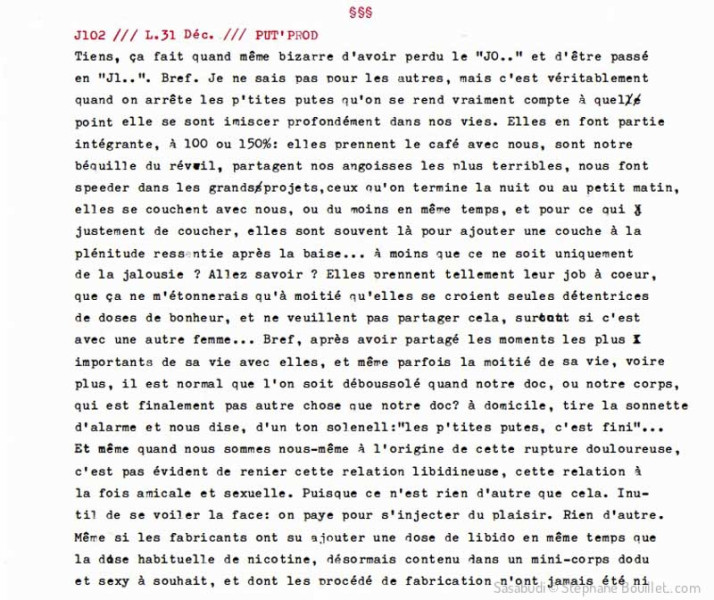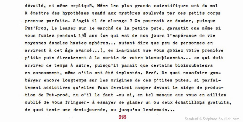 Tiens, ça fait quand même bizarre d'avoir perdu le "J0.. " et d'être passé en "J1..". Bref. Je ne sais pas pour les autres, mais c'est véritablement quand on arrête les p'tites putes qu'on se rend vraiment compte à quel point elle se sont immiscées profondément dans nos vies. Elles en font partie intégrante, à 100 ou 150%: elles prennent le café avec nous, sont notre béquille du réveil, partagent nos angoisses les plus terribles, nous font speeder dans les grands projets, ceux qu'on termine la nuit ou au petit matin, elles se couchent avec nous, ou du moins en même temps, et pour ce qui est justement de coucher, elles sont souvent là pour ajouter une couche à la plénitude ressentie après la baise... à moins que ce ne soit uniquement de la jalousie ? Allez savoir ? Elles prennent tellement leur job à coeur, que ça ne m'étonnerais qu'à moitié qu'elles se croient seules détentrices de doses de bonheur, et ne veuillent pas partager cela, surtout si c'est avec une autre femme... Bref, après avoir partagé les moments les plus importants de sa vie avec elles, et même parfois la moitié de sa vie, voire plus, il est normal que l'on soit déboussolé quand notre doc., ou notre corps, qui est finalement pas autre chose que notre doc. à domicile, tire la sonnette d'alarme et nous dise, d'un ton solennel: "les p'tites putes, c'est fini"... Et même quand nous sommes nous-même à l'origine de cette rupture douloureuse, c'est pas évident de renier cette relation libidineuse, cette relation à la fois amicale et sexuelle. Puisque ce n'est rien d'autre que cela. Inutile de se voiler la face: on paie pour s'injecter du plaisir. Rien d'autre. Même si les fabricants ont su ajouter une dose de libido en même temps que la dose habituelle de nicotine, désormais contenu dans un mini-corps dodu et sexy à souhait, et dont les procédés de fabrication n'ont jamais été ni dévoilés, ni même expliqués. Même les plus grands scientifiques ont du mal à émettre des hypothèses quand aux mystères soulevés par ces petits corps presque parfaits. S'agit-il de clonage ? On pourrait en douter, puisque Put'Prod, le leader sur le marché de la petite pute, garantit que même si vous fumiez pendant 138 ans (ce qui est de nos jours l'espérance de vie moyennes dans les hautes sphères... autant dire que peu de personnes en arrivent à cet âge avancé...) , en imaginant que vous gobiez votre première p'tite pute directement à la sortie de votre biomo-placenta... ce qui doit arriver de temps à autre, puisqu'il parait que certains bioincubateurs en consomment, même s'ils ont été implantés. Bref. De quoi nous faire gamberger encore longtemps sur les origines de ces p'tites putes, si parfaitement addictives qu'elles nous feraient ramper devant le siège de production de Put-prod, nu s'il le faut -ou si, en tel manque que vous en ailliez oublié de vous fringuer- à essayer de glaner un ou deux échantillons gratuits, de quoi tenir une demi-journée, ou jusqu'au lendemain...