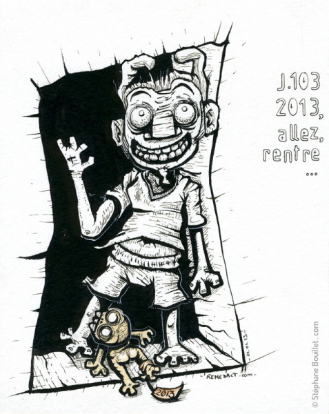 Ca y est. 2013 est devant le pas de la porte, attendant patiemment qu'on lui ouvre. La question est la suivante: a-ton vraiment les envies suffisantes pour lui ouvrir ? En a-t-on simplement réellement les possibilités, ou est -ce encore une illusion ? A-ton mis 2012 dehors avant ? Est-ce qu'on en a fini avec 2012 ? Ou est-elle encore pesante, comme courant inlassablement dans nos veines ? Et dans nos artères ? Est ce déjà 2013 ? Bon allez. C'te carpette, du haut de ses trois pommes, commence déjà à foutre la merde, et y'a tous les voisins qui mattent. Allez, viens, 2013, allez. On va pas y passer la journée, merde ! Rentre ! Ouf. Un petit coucou le sourire niais et le tour est joué. Pourtant j'ai accouché de rien. Ce nouveau "pet" (en anglais, comprenez "animal de compagnie"), m'a été imposé comme à vous. Je n'en ai pas rêvé, de 2013, même si le changement perpétuel qui s'opère en ce bas monde marque un point à chaque changement d'année, et fait sa star, bien loin devant les changements de saison (à tord), les changements de semaines, qui avaient pourtant inventé les WE pour se démarquer. Je ne parle pas ici des changements de jour, minutes, ni même secondes. Eh les gars, on est une seconde après celle de tout à l'heure. Ah non, attendez, ça fait déjà trois... quatre, cinq, six, SEPT; ah merde, on n'arrête pas ce putain de temps ! Il avance, inexorablement, pas à pas, pas à pas, tic, tac. Tic. TaC. Tic. TAC. TIC. Meeeeerde ! Tel un zombie qui ronge nos vies avec ses dênts pourries et manquantes, il nous grignote le cerveau. Finalement, j'aurais peut-être pas du la laisser rentrer, 2013... Et vous ?
