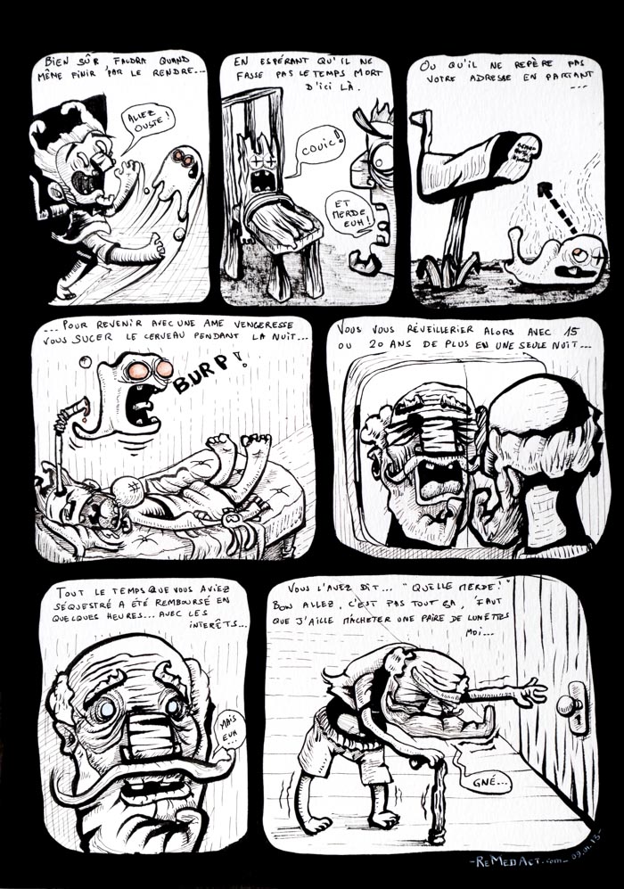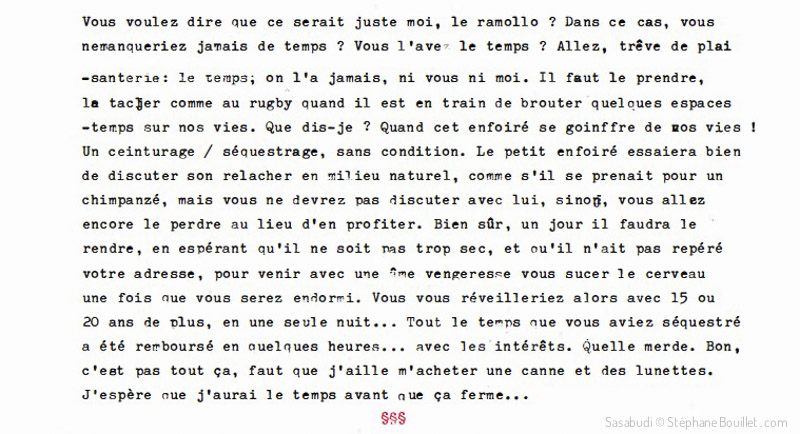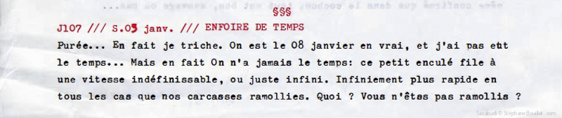 Purée… En fait je triche. On est le 08 janvier en vrai, et j'ai pas eut le temps… Mais en fait on n'a jamais le temps: ce petit enculé file à une vitesse indéfinissable, ou juste infinie. Infiniement plus rapide en tous les cas que nos carcasses ramollies. Quoi ? Vous n'êtes pas ramollis ? Vous voulez dire que ce serait juste moi, le ramollo ? Dans ce cas, vous ne manqueriez jamais de temps ? Vous l'avez le temps ? Allez, trève de plaisanterie: le temps; on l'a jamais, ni vous ni moi. Il faut le prendre, la tacler comme au rugby quand il est en train de brouter quelques espaces -temps sur nos vies. Que dis-je ? Quand cet enfoiré se goinffre de nos vies ! Un ceinturage / séquestrage, sans condition. Le petit enfoiré essaiera bien de discuter son relâcher en milieu naturel, comme s'il se prenait pour un chimpanzé, mais vous ne devrez pas discuter avec lui, sinon, vous allez encore le perdre au lieu d'en profiter. Bien sûr, un jour il faudra le rendre, en espérant qu'il ne soit pas trop sec, et qu'il n'ait pas repéré votre adresse, pour venir avec une âme vengeresse vous sucer le cerveau une fois que vous serez endormi. Vous vous réveilleriez alors avec 15 ou 20 ans de plus, en une seule nuit… Tout le temps que vous aviez séquestré a été remboursé en quelques heures…• Avec les intérêts. Quel le merde. Bon, c'est pas tout ça, faut que j'aille m'acheter une canne et des lunettes. J'espère que j'aurai le temps avant que ça ferme…