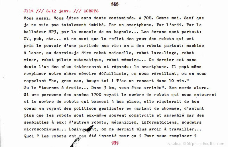 Vous aussi. Vous êtes sans doute contaminés. A 70%. Comme moi. Sauf que je ne suis pas totalement imbibé. Par un smartphone. Par l'ordi. Par le balladeur MP3, par la console de ma bagnole... Les écrans sont partout: TV, pub, etc... et ne sont que le reflet des yeux des robots qui ont pris le pouvoir d'une partie de nos vie: on a des robots partout: machine à laver, ou devrais-je dire robot vaisselle, robot lave-linge, robot mixer, robot pilote automatique, robot mémoire... Ce dernier est sans doute l'un des plus intéressants et répandus: le smartphone. Il peut même remplacer notre chère mémoire défaillante, en nous réveillant, ou en nous rappelant "he, gros sac, bouge toi ! T'as un rencart dans 10 min." Ou le "tournez à droite... Dans 3 km, vous êtes arrivé". Ben merde alors. Si une personne des années 1700 voyait le nombre de robots qui nous entourent et le nombre de robots qui bossent à nos places, elle rigolerait de bon coeur en voyant des politicos gesticuler en parlant de chomage, d'autant plus que les robots sont eux-même souvent construits et assemblés par des semblables à eux: d'autres robots, mécaniciens, informaticiens, soudeurs microscopiques... Logiquement, on ne devrait plus avoir à travailler... Quoi ? les robots n'ont pas été inventés pour ça ? Pour nous remplacer ?