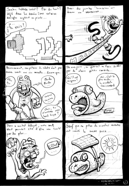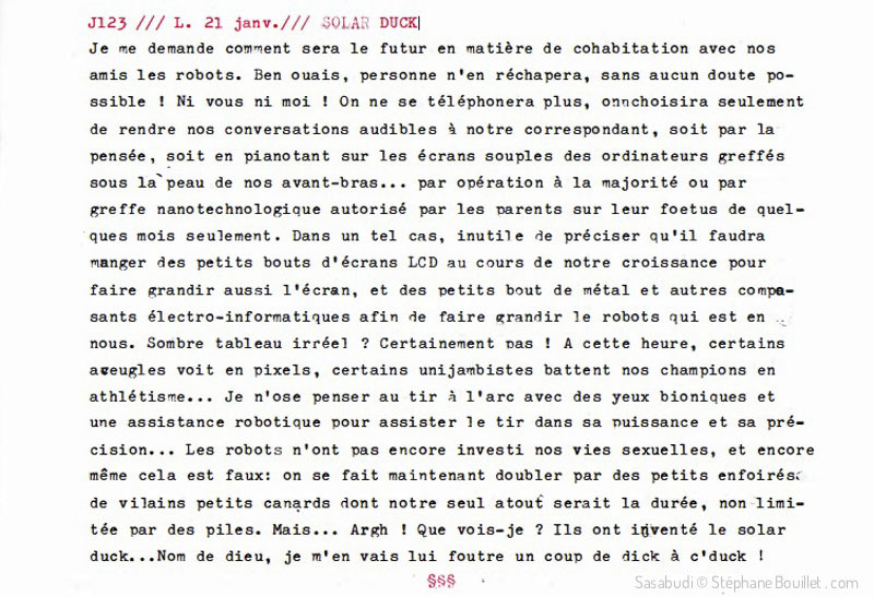 Je me demande comment sera le futur en matière de cohabitation avec nos amis les robots. Ben ouais, personne n'en réchappera, sans aucun doute possible ! Ni vous ni moi ! On ne se téléphonera plus, on choisira seulement de rendre nos conversations audibles à notre correspondant, soit par la pensée, soit en pianotant sur les écrans souples des ordinateurs greffés sous la peau de nos avant-bras... par opération à la majorité ou par greffe nonotechnologique autorisée par les parents sur leur fœtus de quelques mois seulement. Dans un tel cas, inutile de préciser qu'il faudra manger des petits bouts d'écrans LCD au cours de notre croissance pour faire grandir aussi l'écran, et des petits bouts de métal et autres composants électro-informatiques afin de faire grandir le robot qui est en nous. Sombre tableau irréel ? Certainement pas ! A cette heure, certains aveugles voient en pixels, certains uni-jambistes battent nos champions en athlétisme... Je n'ose penser au tir à l'arc avec des yeux bioniques et une assistance robotique pour assister le tir dans sa puissance et sa précision... Les robots n'ont pas encore investi nos vies sexuelles, et encore même cela est faux: on se fait maintenant doubler par des petits enfoirés; de vilains petits canards dont notre seul atout serait la durée, non-limitée par des piles. Mais... Argh ! Que vois-je ? Ils ont inventé le solar duck... Nom de dieu, je m'en vais lui foutre un coup de dick à c'duck...