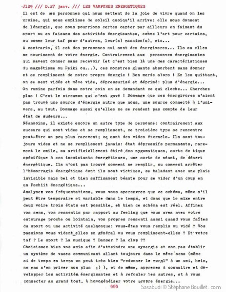 Néanmoins, il existe encore un autre type de personne: contrairement aux suceurs qui sont vides et se remplissent, ce troisième type se rencontre peut-être un peu plus rarement; ce sont des vides éternels. Ils sont toujours vides et ne se remplissent jamais: état dépressif permanent, rarement le smile, ou artificiellement étiré des zygomatiques, sorte de tique spécifique à ces inexistants énergétiques, une sorte de néant, de désert énergétique. Ils n'ont pas trouvé comment se remplir, ou comment arrêter l'hémorragie énergétique dont ils sont victimes, se baladant avec une plaie invisible mais bel et bien suffisament béante pour se vider d'un coup en un Pschiit énergétique...