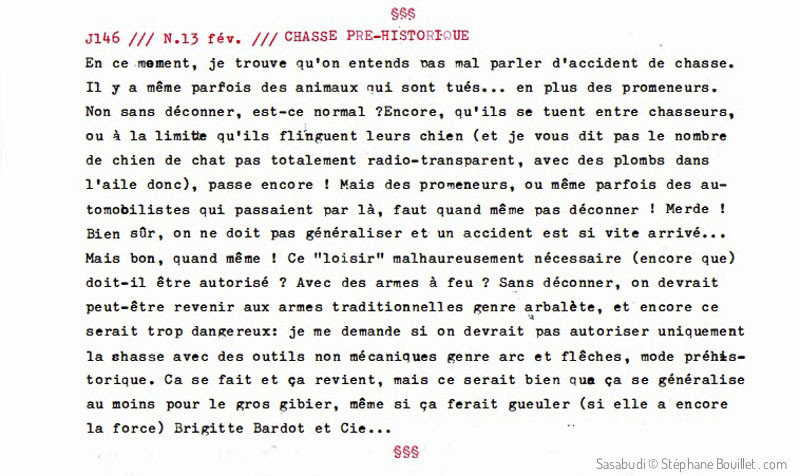 En ce moment, je trouve qu'on entend pas mal parler d'accidents de chasse. Il y a même parfois des animaux qui sont tués... en plus des promeneurs. Non sans déconner, est-ce normal ? Encore, qu'ils se tuent entre chasseurs, ou à la limite qu'ils flinguent leurs chien (et je vous dis pas le nombre de chiens de chasse pas totalement radio-transparent, avec des plombs dans l'aile donc), passe encore ! Mais des promeneurs, ou même parfois des automobilistes qui passaient par là, faut quand même pas déconner ! Merde ! Bien sûr, on ne doit pas généraliser et un accident est si vite arrivé... Mais bon, quand même ! Ce "loisir" malheureusement nécessaire (encore que) doit-il être autorisé ? Avec des armes à feu ? Sans déconner, on devrait peut-être revenir aux armes traditionnelles genre arbalète, et encore ce serait trop dangereux: je me demande si on devrait pas autoriser uniquement la chasse avec des outils non mécaniques genre arcs et flèches, mode préhistorique. Ca se fait et ça revient, mais ce serait bien que ça se généralise au moins pour le gros gibier, même si ça ferait gueuler (si elle en a encore la force) Brigitte Bardot et Cie...