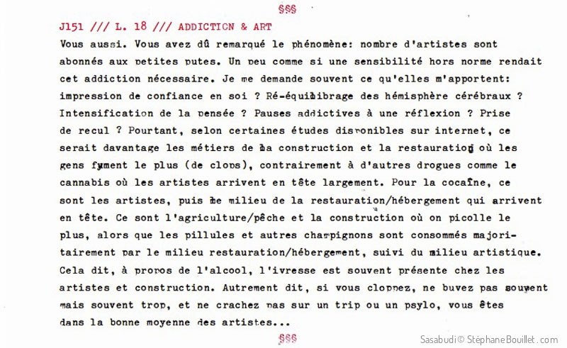 Vous aussi. Vous avez du remarqué le phénomène: nombre d'artistes sont abonnés aux petites putes. Un peu comme si une sensibilité hors norme rendait cet addiction nécessaire. Je me demande souvent ce qu'elles m'apportent: impression de confiance en soi ? Ré-équilibrage des hémisphères cérébraux ? Intensification de la pensée ? Pauses addictives à une réflexion ? Prise de recul ? Pourtant, selon certaines études disponibles sur internet, ce serait davantage les métiers de la construction et la restauration où les gens fument le plus (de clops), contrairement à d'autres drogues comme le cannabis où les artistes arrivent en tête largement. Pour la cocaïne, ce sont les artistes, puis me milieu de la restauration / hébergement qui arrivent en tête. Ce sont l'agriculture / pêche et la construction où on picole le plus, alors que les pillules et autres champignons sont consommés majoritairement par le milieu restauration / hébergement, suivi du milieu artistique. Cela dit, à propos de l'alcool, l'ivresse est souvent présente chez les artistes et dans la construction. Autrement dit, si vous cloppez, ne buvez pas souvent mais souvent trop, et ne crachez pas sur un trip ou un psylo, vous êtes dans la bonne moyenne des artistes...