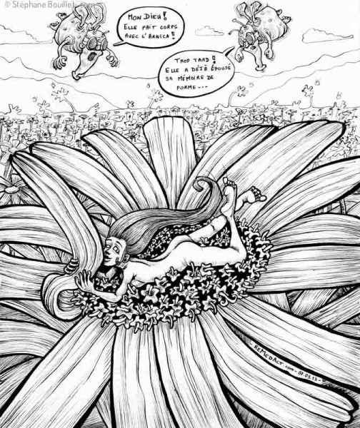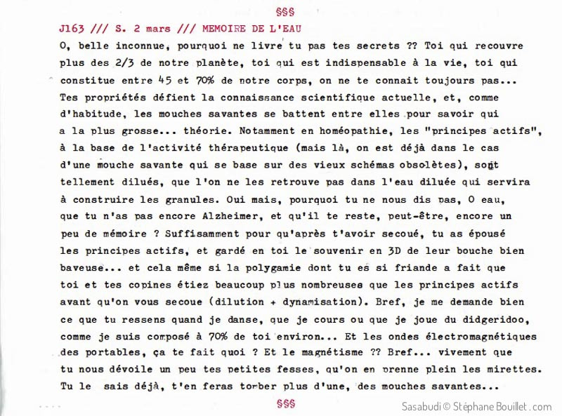 Ô, belle inconnue, pourquoi ne livres-tu pas tes secrets ?? Toi qui recouvre plus des 2/3 de notre planète, toi qui est indispensable à la vie, toi qui constitue entre 45 et 70% de notre corps, on ne te connait toujours pas... Tes propriétés défient la connaissance scientifique actuelle, et, comme d'habitude, les mouches savantes se battent entre elles pour savoir qui a la plus grosse... théorie. Notamment en homéopathie, les "principes'actifs", à la base de l'activité thérapeutique (mais là, on est déjà dans le cas d'une mouche savante qui se base sur de vieux schémas obsolètes), sont tellement dilués, que l'on ne les retrouve pas dans l'eau diluée qui servira à construire les granules. Oui mais, pourquoi tu ne nous dis pas, Ô eau, que tu n'as pas encore Alzheimer, et qu'il te reste, peut-être, encore un peu de mémoire ? Suffisamment pour qu'après t'avoir secoué, tu as épousé les principes actifs, et gardé en toi le souvenir en 3D de leur bouche bien baveuse... et cela même si la polygamie dont tu es si friande a fait que toi et tes copines étiez beaucoup plus nombreuses que les principes actifs avant qu'on ne vous secoue (dilution + dynamisation). Bref, je me demande bien ce que tu ressens quand je danse, que je cours ou que je joue du digeridoo, comme je suis composé à 70% de toi environ... Et les ondes électromagnétiques des portables, ça te fait quoi ? Et le magnétisme ?? Bref... vivement que tu nous dévoiles un peu tes petites fesses, qu'on en prenne plein les mirettes. Tu le sais déjà, t'en feras tomber plus d'une, des mouches savantes...