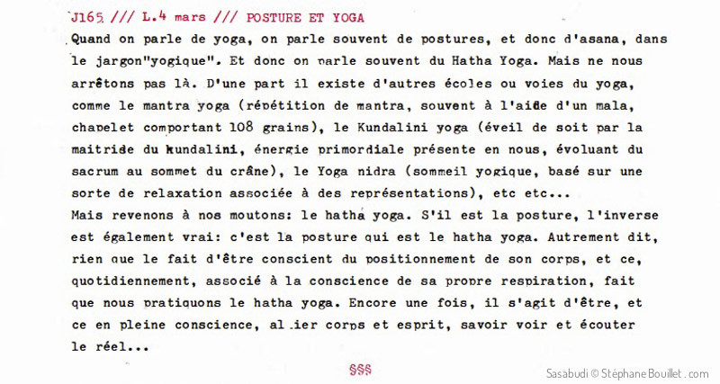 Quand on parle de yoga, on parle souvent de postures, et donc d'asanas, dans le jargon "yogique". Et donc on parle souvent du Hatha Yoga. Mais ne nous arrêtons pas là... D'une part il existe d'autres écoles ou voies du yoga, comme: • le Mantra yoga (répétition de mantra, souvent à l'aide d'un mala, chapelet comportant 108 grains), • le Kundalini yoga (éveil de soit par la maitrise du kundalini, énergie primordiale présente en nous, évoluant du sacrum au sommet du crâne), • le Yoga nidra (sommeil yogique, basé sur une sorte de relaxation associée à des représentations), etc. Mais revenons à nos moutons: le Hatha yoga. S'il est la posture, l'inverse est également vrai : c'est la posture qui est le Hatha yoga. Autrement dit, rien que le fait d'être conscient du positionnement de son corps, et ce, quotidiennement, associé à la conscience de sa propre respiration, fait que nous pratiquons le Hatha yoga. Encore une fois, il s'agit d'être, et ce en pleine conscience; allier corps et esprit, savoir voir et écouter le réel...