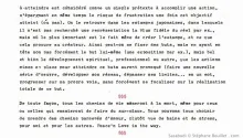 Hier je me suis pris le "Bio contact" à l'Epicerie verte. C'est pas pour faire de la pub, hein, en particulier pour cette feuille de choux, que je trouve toujours blindée à outrance de pub. Bref, je l'ai pris car c'était un spécial Japon; et rien que l'édito vaut le coup et remet les points sur les i, en citant Lao-Tseu: "Le bonheur n'est pas une destination, c'est une façon de voyager". Ça fait un bel écho à mon billet d'hier que j'ai tapé juste avant de lire ça. Autrement dit, l'important n'est pas le but, l'objectif, ou le sommet de la montagne, mais le chemin que l'on empruntera pour y parvenir. Dans le voyage comme dans tout, ce proverbe est applicable: notamment dans les arts. L'important n'est pas forcément que mon oeuvre soit absolument réussi, pourvu que son accomplissement m'ait fait progresser, m'ait apporté une certaine plénitude ou autre. Idem aussi pour la musique, par ex.: même s'il est important que le final ne soit pas cacophonique, l'important n'est-il pas plus l'expérimentation associée aux liens qu'elle aura suscités ? Bref, pour en revenir à l'édito, Jean-Pierre Camo y rappelle que les occidentaux s'intéressent en général au but seulement, en recherchant économie d'argent de temps, et d'effort, contrairement aux orientaux, pour lesquels l'objectif à atteindre est considéré comme un simple prétexte à accomplir une action, s'épargnant en même temps le risque de frustration une fois cet objectif atteint (ou pas). On le retrouve ce principe dans les estampes japonaises, dans lesquelles il n'est pas recherché une représentation la plus fidèle du réel par ex., mais où le plus important est le fait même de créer l'estampe, et ce que cela procure au créateur. Ainsi peut-on se fixer des buts, mais en ayant en tête non pas forcément le but lui