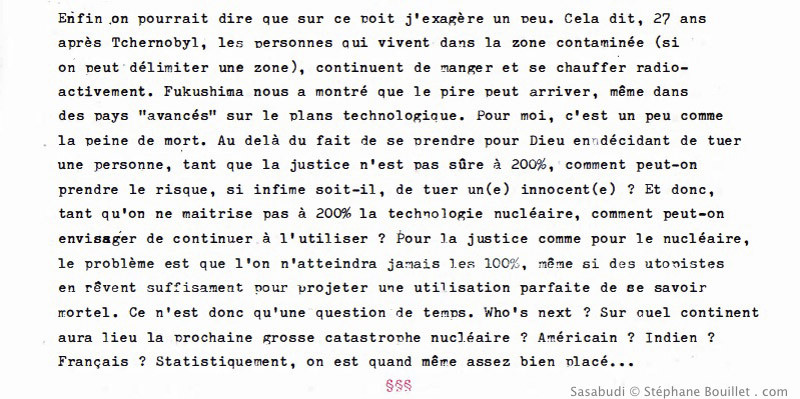 Enfin on pourrait dire que sur ce point j'exagère un peu. Cela dit, 27 ans après Tchernobyl, les personnes qui vivent dans la zone contaminée (si on peut réellement délimiter telle une zone), continuent de manger et se chauffer radio- activement. Fukushima nous a montré que le pire peut arriver, même dans des pays "avancés" sur le plan technologique. Pour moi, c'est un peu comme la peine de mort. Au delà du fait de se prendre pour Dieu en décidant de tuer une personne, tant que la justice n'est pas sûre à 200%, comment peut-on prendre le risque, si infime soit-il, de tuer un(e) innocent(e) ? Et donc, tant qu'on ne maitrise pas à 200% la technologie nucléaire, comment peut-on envisager de continuer à l'utiliser ? Pour la justice comme pour le nucléaire, le problème est que l'on n'atteindra jamais les 1OO%, même si des utopistes en rêvent suffisamment pour projeter une utilisation parfaite de ce savoir mortel. Ce n'est donc qu'une question de temps. Who's next ? Sur quel continent aura lieu la prochaine grosse catastrophe nucléaire ? Américain ? Indien ? Français ? Statistiquement, on est quand même assez bien placé...