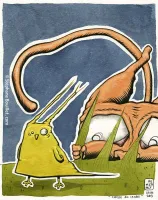 Légende : une femelle, entre chatte et écureuil, fait un fuck en tenant son skate cassé. Elle a des piercings au sourcil, au nez, et au tétons.