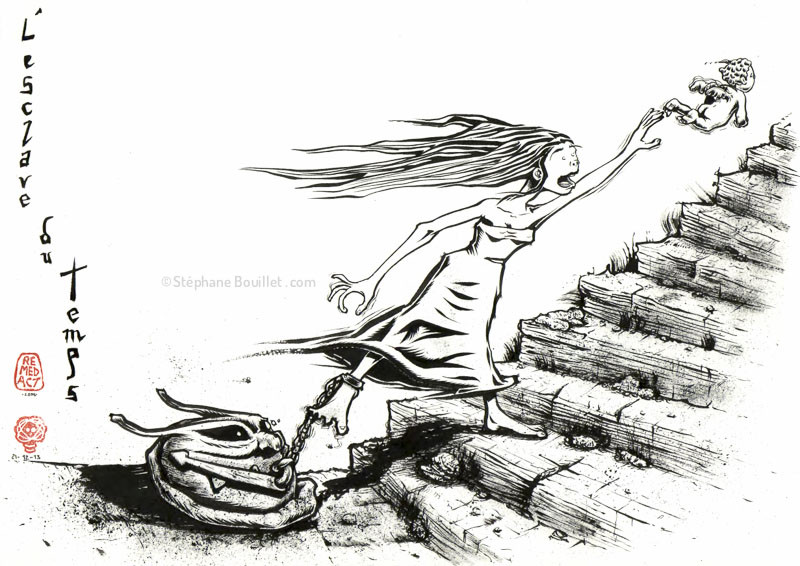 ILLUSTRATION : Une femme pieds nus essaie d'attraper un angelot (son présent), alors que son passé ou futur la retient en bas: le temps TEXTE : C'est nous. C'est notre faute. C'est à cause de nous, qu'on n'a plus le temps. Il fallait pas l'inviter. Fallait pas l'inventer ! Du coup, nous en sommes les premiers esclaves, et devons le porter avec nous, en nous, à longueur de temps. Et il arrive même à se cacher et à nous le faire perdre, chercher... Ne comptant pas sur lui, mais comptant les heures qu'il nous reste. Avant... quoi ? Avant la nuit. Ainsi donc le temps serait-il naturel ? Serait-il une invention supra-naturel, entre journée, saison et année ? Mais si ce n'était que cela, ça irait encore, ce qui tue, ce sont les secondes inutiles qui tiquent et taclent dans nos têtes, et le poids des années, parce qu'un imbécile a un jour, ou une nuit, décidé de les compter. La belle affaire: il ou elle aurait mieux fait de se casser une jambe au lieu de nous enchaîner au passé et à l'à venir, sans avoir le temps de gérer le présent qui s'envole. Sans prendre le temps de lui arracher ses ailes, une par une, et de se laisser bercer dans cet instant tiède et infini...