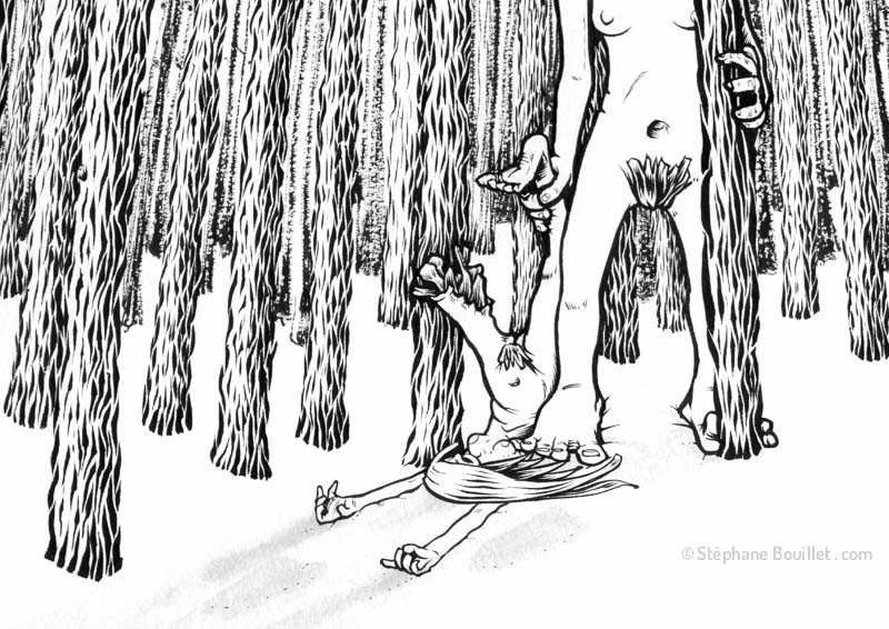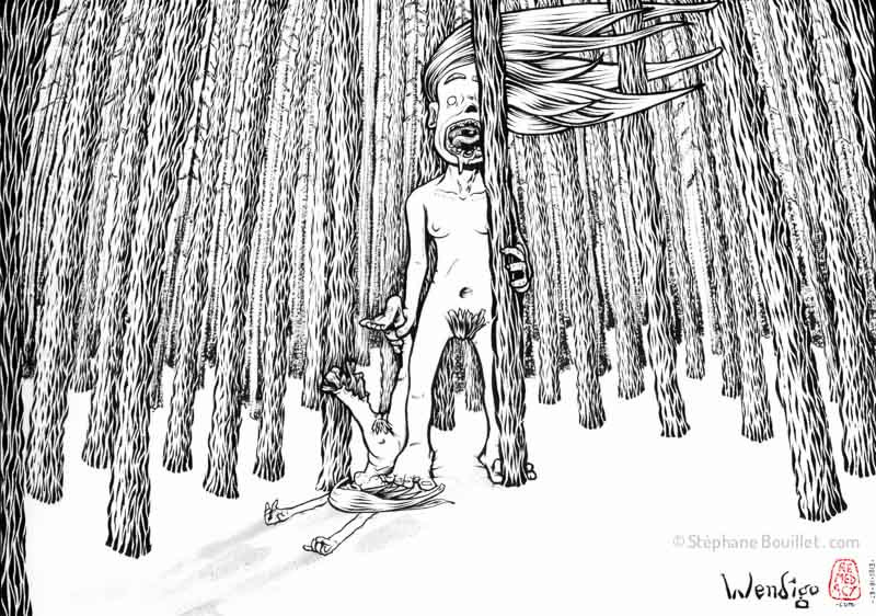 Allez. Ben pourquoi pas ? Tant qu'on y est ! Donc toujours sur les fils du Grand-Esprit, de Jean Pictet, quand tu vas chasser dans les bois et que tu... Hein.? Quoi comment ça "Moi je chasse pas"... ? Hein ? Et en plus t'aimes pas la forêt ? Bref, je disais, quand tu vas chasser OU te balader dans les bois en hiver, reste cool et fait pas trop de bruit, et surtout, si tu croises un... un ? Hein ? Quoi ? Tu te balades pas en hiver dans les bois ? Purée tu vas t'la fermer, sinon... sinon... Bref, Si tu croises en plein milieu de ton blokos de merde un géant au cœur de glace, qui plus est, pousse des cris effrayants, sache que tu viens sans doute de tomber (eh si, bien fait pour ta gueule, ça t'apprendras à me couper quand je raconte une histoire) sur un Wendigo. Et ça, c'est vraiment pas de chance, car comme tous les wendigos, il est à la recherche de qui dévorer. Ben ouais: il est cannibale. Hein ? Quoi encore ? Pas cannibale? Hein? Parce qu'il ne mange pas les autres de sa propre espèce ? Ah ah... Tiens, retourne toi... rhin hin hin...