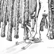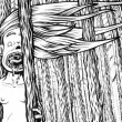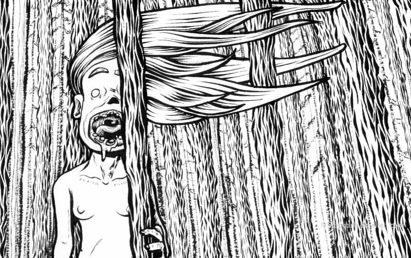 légende : une wendigo (ou windigo), cheveux au vent, tient une femme nue dont elle a déjà mangé une jambe, en plein milieu d'une forêt de sapins enneigée.