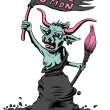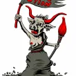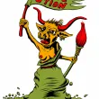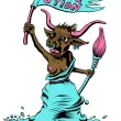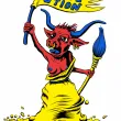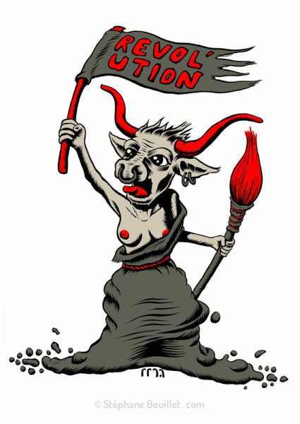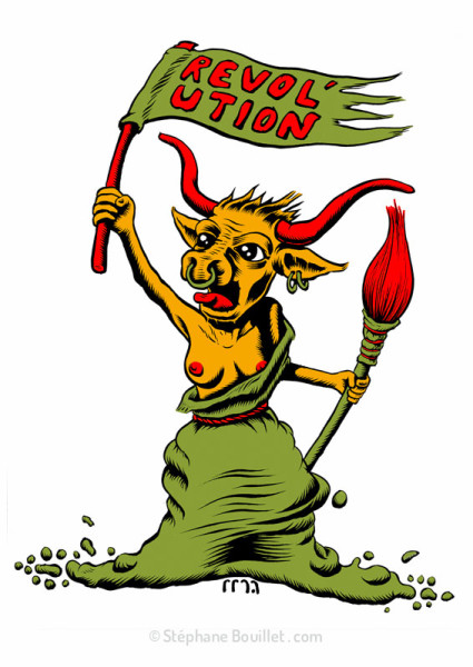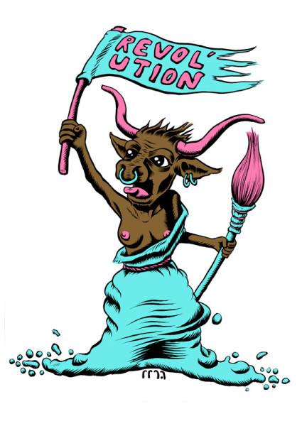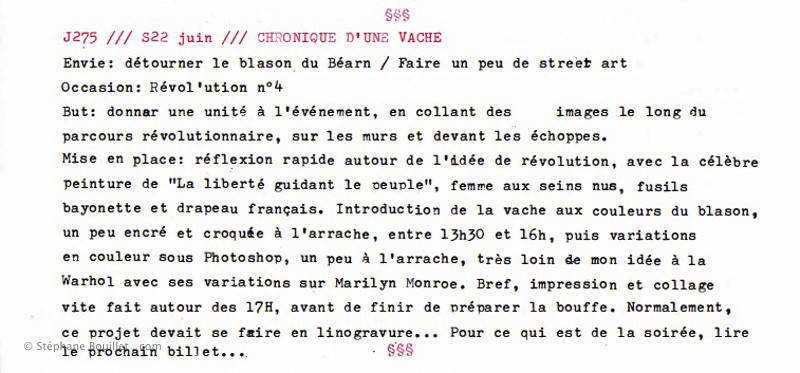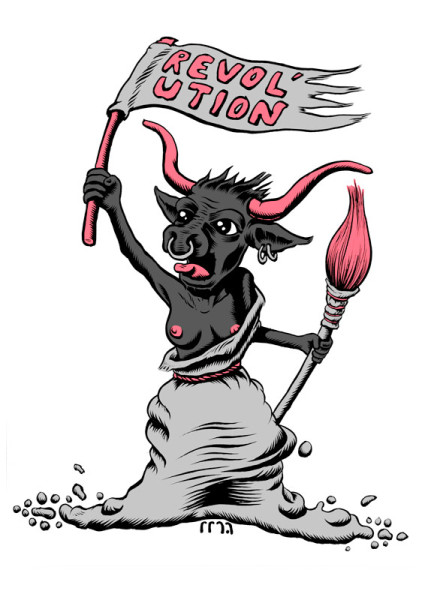 Une vache béarnaise aux seins nus, dans la position de la Mariane du tableau d'Eugène Delacroix, "La liberté guide le peuple", brandit un drapeau "Révol'ution" et un pinceau, symbole artistique. Détournement du blason béarnais pour la Révol'ution, vernissages en commun d'ateliers artistiques à Oloron Sainte Marie (64).