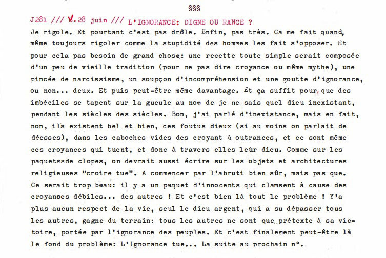 Je rigole. Et pourtant c'est pas drôle. Enfin, pas très. Ça me fait quand même toujours rigoler comme la stupidité des hommes les fait s'opposer. Et pour cela pas besoin de grand chose: une recette toute simple serait composée d'un peu de vieille tradition (pour ne pas dire croyance ou même mythe), une pincée de narcissisme, un soupçon d'incompréhension et une goutte d'ignorance, ou non... deux. Et puis peut-être même davantage. Et ça suffit pour que des imbéciles se tapent sur la gueule au nom de je ne sais quel dieu inexistant, pendant les siècles des siècles. Bon, j'ai parlé d'inexistence, mais en fait, non, ils existent bel et bien, ces foutus dieux (si au moins on parlait de déesses), dans les caboches vides des croyant à outrances, et ce sont même ces croyances qui tuent, et donc à travers elles leur(s) dieu(x). Comme sur les paquets de clopes, on devrait aussi écrire sur les objets et architectures religieuses "croire tue". À commencer par l'abruti bien sûr, mais pas que. Ce serait trop beau: il y a un paquet d 'innocents qui clamsent à cause des croyances débiles... des autres ! Et c'est bien là tout le problème ! Y'a plus aucun respect de la vie, seul le dieu argent, qui a su dépasser tous les autres, gagne du terrain: tous les autres ne sont que prétexte à sa victoire, portée par l'ignorance des peuples. Et c'est finalement peut-être là le fond du problème: L'Ignorance tue... La suite au prochain n°.