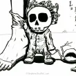 légende : un bébé portant un masque de tête de mort tire la chaussette d'un de ses parents, en tenant sa peluche poule