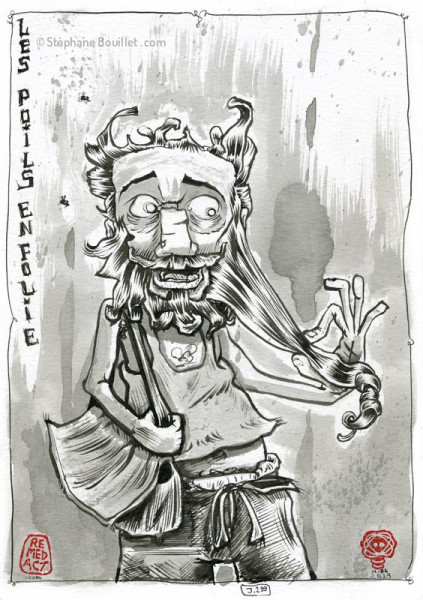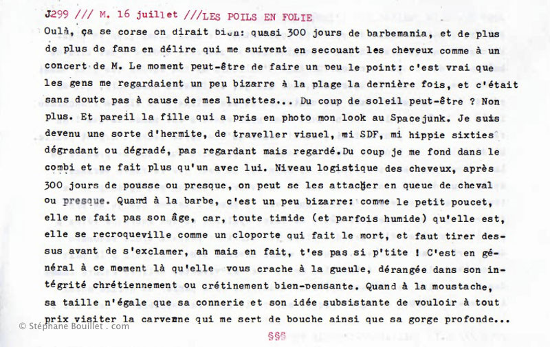 Houlà, ça se corse on dirait bien: quasi 300 jours de barbemania, et de plus de plus de fans en délire qui me suivent en secouant les cheveux comme à un concert de M. Le moment peut-être de faire un peu le point: c'est vrai que les gens me regardaient un peu bizarre à la plage la dernière fois, et c'était sans doute pas à cause de mes lunettes... Du coup de soleil peut-être ? Non plus. Et pareil la fille qui a pris en photo mon look au Spacejunk. Je suis devenu une sorte d’ermite, de traveller visuel, mi-SDF, mi-hippie sixties dégradant ou dégradé, pas regardant mais regardé. Du coup je me fond dans le Combi et ne fait plus qu'un avec lui. Niveau logistique des cheveux, après 300 jours de pousse ou presque, on peut se les attacher en queue de cheval ou presque. Quant à la barbe, c'est un peu bizarre: comme le petit poucet, elle ne fait pas son âge, car, toute timide (et parfois humide) qu'elle est, elle se recroqueville comme un cloporte qui fait le mort, et faut tirer dessus avant de s'exclamer, ah mais en fait, t'es pas si p'tite ! C'est en général à ce moment là qu'elle :vous crache à la gueule, dérangée dans son intégrité chrétiennement ou crétinement bien-pensante. Quand à la moustache, sa taille n'égale que sa connerie et son idée subsistante de vouloir à tout prix visiter la caverne qui me sert de bouche ainsi que sa gorge profonde...