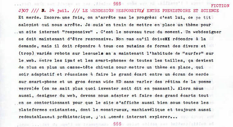 Et merde. Encore une fois, on n'arrête pas le progrès: c'est lui, ce petit salopiot qui nous arrête. Je suis en train de mettre en place un thème pour un site internet "responsive". C'est le nouveau truc du moment. Un webdesigner se doit maintenant d'être responsive. Non pas qu'il doive répondre à la demande, mais il doit répondre à tous ces putains de formats des divers et (trop) variés robots sur lesquels on a maintenant l'habitude de "surfer" sur le web. Entre les ipad et les smart-phones de toutes les tailles, ça devient de plus en plus un casse-tête chinois pour mettre un thème en place, qui soit adaptatif et réussisse à faire le grand écart entre un écran de merde sur smart-phone et un gros écran wide HD, sans parler des rétina de la pomme vérolée (qui ne sait plus quoi inventer soit dit en passant). Alors nous aussi, designer du web, devons nous adapter et faire des grand-écarts tout en se contorsionnant pour que le site s'affiche aussi bien sous toutes les plate-formes existantes, dont le monstrueux, machiavélique et toujours aussi redoutablement préhistorique, j'ai nommé: internet explorer...