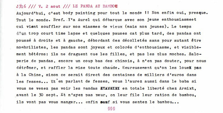 Aujourd'hui, c'est body painting pour tout le monde !! Non enfin oui, presque. Tout le monde. Bref. Y'a Aurel qui débarque avec son jeune enthousiasme et qui vient souffler sur nos miasmes de vieux (mais non jeunes). Le temps d'un trop court time-lapse et quelques pauses cat plus tard, des pandas ont poussé à droite et à gauche, débordant des décolletés sans pour autant être nombrilistes, les pandas sont joyeux et colorés d'enthousiasme; et visiblement hétéros: ils ne draguent que les filles, et pas les plus moches. Saloperie, de pandas, encore un coup bas des chinois, à n'en pas douter, pour nous détrôner, et rafler la mise toute chaude. Heureusement qu'on les loue pas à la Chine, sinon ce serait direct des centaines de milliers d'euros dans les fesses... Et en parlant de fesses, vous l'aurez aussi dans le baba si vous ne venez pas voir les pandas en totale liberté chez Armixt, avant le 30 sept. Et n'ayez pas peur, on leur file leur ration de bambou, ils vont pas vous manger... enfin sauf si vous sentez le bambou...