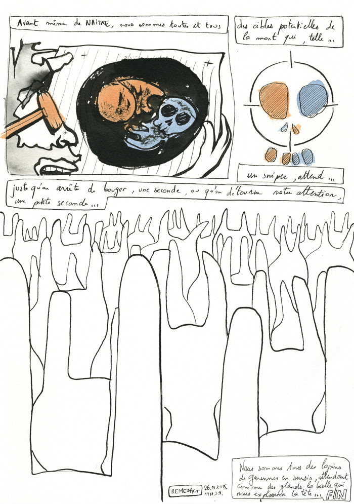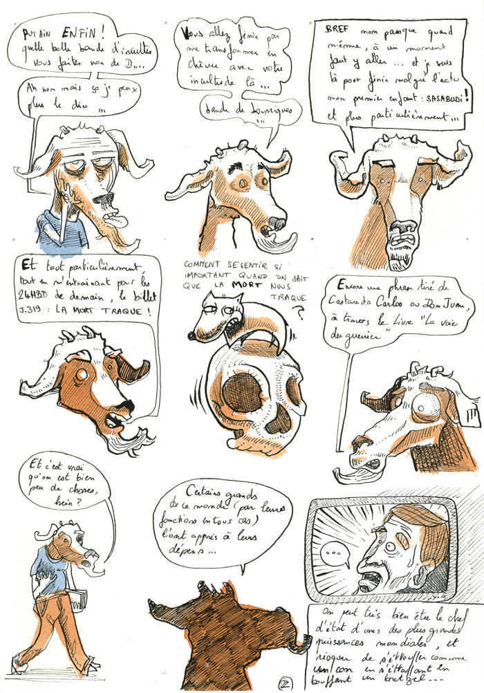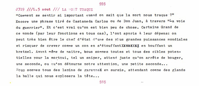 "Comment se sentir si important quand on sait que la mort nous traque ?" Encore une phrase tiré de Carlos Castaneda ou de Don Juan, à travers "La voie du guerrier". Et c'est vrai qu'on est bien peu de chose. Certains Grand de ce monde (par leurs fonctions en tous cas), l'ont appris à leur dépens: on peut très bien être le chef d'état d'une des plus grandes puissances mondiales et risquer de crever comme un con en s'étouffant en bouffant un bretzel. Avant même de naître, nous sommes toutes et tous des cibles potentielles pour la mort qui, tel un sniper, attend juste qu'on arrête de bouger, une seconde, ou qu'on détourne notre attention, une petite seconde… Nous sommes tous des lapins de garenne en sursis, attendant comme des glands la balle qui nous explosera la tête…