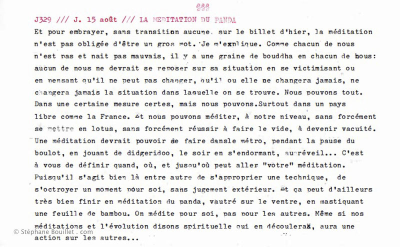 TEXTE : Et pour embrayer, sans transition aucune, sur le billet d'hier, la méditation n'est pas obligée d'être un gros mot. Je m'explique. Comme chacun de nous n'est pas et naît pas mauvais, il y a une graine de Bouddha en chacun de nous: aucun de nous ne devrait se reposer sur sa situation en se victimisant ou en pensant qu'il ne peut pas changer, qu'il ou elle ne changera jamais, ne changera jamais la situation dans laquelle on se trouve. Nous pouvons tout. Dans une certaine mesure certes, mais nous pouvons. Surtout dans un pays libre comme la France. Et nous pouvons méditer, à notre niveau, sans forcément se mettre en lotus, sans forcément réussir à faire le vide, à devenir vacuité. Une méditation devrait pouvoir de faire dans le métro, pendant la pause du boulot, en jouant du didgeridoo, le soir en s'endormant, au réveil... C'est à vous de définir quand, où, et jusqu'où peut aller "votre" méditation. Puisqu'il s'agit bien là entre autre de s'approprier une technique, de s'octroyer un moment pour soi, sans jugement extérieur. Et ça peut d'ailleurs très bien finir en méditation du panda, vautré sur le ventre, en mastiquant une feuille de bambou. On médite pour soi, pas pour les autres. Même si nos méditations et l'évolution -disons, spirituelle- qui en découlera, aura une action sur les autres...