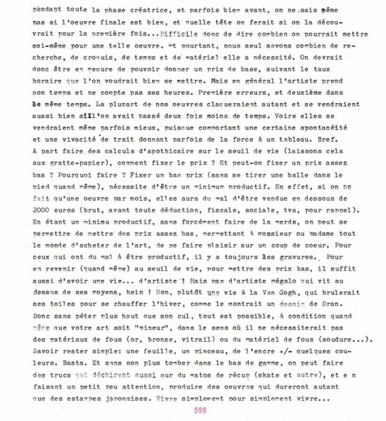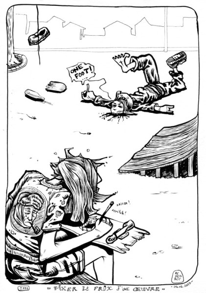 Deuxième jour d'expo. On m'a parfois dit que je n'étais pas cher... enfin, mes "œuvres". Et c'est là que sans transition je vous annonce le sujet de ce billet: comment fixer le prix d'un tableau (ou tout autre sorte d’œuvre) ? C'est vrai que c'est parmi les plus difficiles des exercices pour un artiste. D'abord puisqu'on ne fait pas ça pour vendre, enfin pas au début, et que donc l'artiste "de base" est une merde commercialement parlant. À la limite s'il a un peu bossé en marketing... Bref. Comme on a le nez sur notre œuvre pendant toute la phase créatrice, et parfois bien avant, on ne sait même pas si l’œuvre finale est bien, et quelle tête on ferait si on la découvrait pour la première fois... Difficile donc de dire combien on pourrait mettre soi-même,pour une telle œuvre. Et pourtant, nous seul savons combien de recherche, de croquis, de temps et de matériel elle a nécessité. On devrait donc être en mesure de pouvoir donner un prix de base, suivant le taux horaire que l'on voudrait bien se donner. Mais en général l'artiste prend son temps et ne compte pas ses heures. Première erreur, et deuxième dans le même temps. La plupart de nos œuvres claqueraient autant et se vendraient aussi bien si l'on avait passé deux fois moins de temps. Voire elles se vendraient même parfois mieux, puisque comportant une certaine spontanéité et une vivacité de trait donnant parfois de la force à un tableau. Bref. A part faire des calculs d'apothicaire sur le seuil de vie (laissons cela aux gratte-papiers), comment fixer le prix ? Et peut-on fixer un prix assez bas ? Pourquoi faire ? Fixer un bas prix (sans se tirer une balle dans le pied quand même), nécessite d'être un minimum productif. En effet, si on ne fait qu'une œuvre par mois, elle aura du