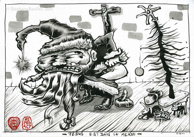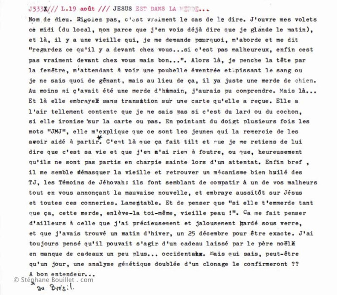 Nom de dieu. Rigolez pas, c'est vraiment le cas de le dire. J'ouvre mes volets ce midi (du local, non parce que j'en vois déjà dire que je glande le matin), et là, il y a une vieille qui, je me demande pourquoi, m'aborde et me dit "regardez ce qu'il y a devant chez vous... si c'est pas malheureux, enfin cest pas vraiment devant chez vous mais bon...". Alors là, je penche la tête par la fenêtre, m'attendant à voir une poubelle éventrée et pissant le sang ou je ne sais quoi de gênant, mais au lieu de ça, il y a juste une merde de chien. Au moins si ç'avait été une merde d'humain, j'aurais pu comprendre. Mais là... Et là elle embraye sans transition sur une carte qu'elle a reçue. Elle a l'air tellement contente que je ne sais pas si c'est du lard ou du cochon, si elle ironise sur la carte ou pas. En pointant du doigt plusieurs fois les mots "JMJ", elle m'explique que ce sont les jeunes qui la remercient de les avoir aidé à partir *. C'est là que ça fait tilt et que je me retiens de lui dire que c'est sa vie et que j'en n'ai rien à foutre, ou que, heureusement qu'ils ne sont pas partis en charpie sainte lors d'un attentat. Enfin bref, il me semble démasquer la vieille et retrouver un mécanisme bien huilé des TJ, les Témoins de Jéhovah: ils font semblant de compatir à un de vos malheurs tout en vous annonçant la mauvaise nouvelle, et embraye aussitôt sur Jésus et toutes ces conneries. Lamentable. Et de penser que "si elle t'emmerde tant que ça, cette merde, enlève-la toi-même, vieille peau !" . Ça me fait penser d'ailleurs à celle que j'ai précieusement et jalousement gardé sous verre, et que j'avais trouvé un matin d'hiver, un 25 décembre pour être exacte. J'ai toujours pensé qu'il pouvait s'agir d'un cadeau laissé par le père noël en manque de cadeau