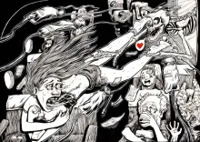 C'était le bordel intégral. Je ne crois pas nue vous puissiez une seconde vous imaginer ce que cela puisse être. La preuve: vous êtes encore vivant. Tout volait ou virevoltait autour de moi. Je agrippais à mon siège comme une araignée à sa toile quand on passe l'aspirateur. Et c'est bien de ça qu'il s'agissait: comme un gigantesque aspirateur qui nous aspirait comme des vulgaires moustiques, mais qui ne volaient plus. Et c'est bien de ça qu'il s'agissait: on ne volait plus. L'avion ne volait plus, et perdait ses entrailles dont nous faisions partie, comme de vulgaires asticots. C'est là, alors que voyais encore quelques énergumènes, la bouche grande ouverte, mais dont aucun sons ne semblaient sortir, que je l'ai senti. Sa main, remontant le long de ma jambe, puis de ma cuisse, alors que son autre main me maintenait la cheville. Elles étaient froides, c'est tout ce dont je me souvienne, et rugueuses... comme la mort. Car c'est bien de ça qu'il s'agissait: la mort aurait voulu que je lâche mon accoudoir, et que je me laisse aspirer par le néant, là, dehors. Ce qui est marrant, enfin , si l'on peut dire, c'est que je n'entendait plus rien: les hurlements, l'aspiration, et même cette espèce de faucheuse qui semblait me parler, et articuler avec insistance les mêmes mots "I love U". C'est tout ce dont je me rappelle...
