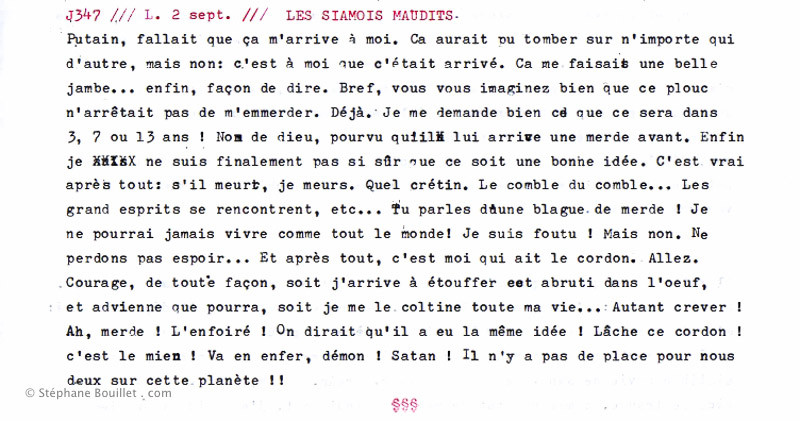 Putain, fallait que ça m'arrive à moi. Ça aurait pu tomber sur n'importe qui d'autre, mais non: c'est à moi que c'était arrivé. Ça me faisait une belle jambe... enfin, façon de dire. Bref, vous vous imaginez bien que ce plouc n'arrêtait pas de m'emmerder. Déjà. Je me demande bien ce que ce sera dans 3, 7 ou 13 ans. Nom de dieu, pourvu qu'il lui arrive une merde avant. Enfin je ne suis finalement pas si sûr que ce soit une bonne idée. C'est vrai après tout: s'il meurt, je meurs. Quel crétin. Le comble du comble... Les grand esprits se rencontrent, etc... Tu parles d'une blague de merde ! Je ne pourrai jamais vivre comme tout le monde! Je suis foutu ! Mais non. Ne perdons pas espoir... Et après tout, c'est moi qui ait le cordon. Allez. Courage, de toute façon, soit j'arrive à étouffer cet abruti dans l’œuf, et advienne que pourra, soit je me le coltine toute ma vie... Autant crever ! Ah, merde ! L'enfoiré ! On dirait qu'il a eu la même idée ! Lâche ce cordon c'est le mien ! Va en enfer, démon ! Satan ! Il n'y a pas de place pour nous deux sur cette planète !!