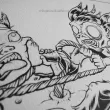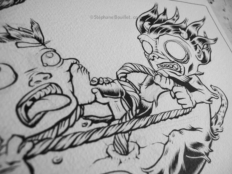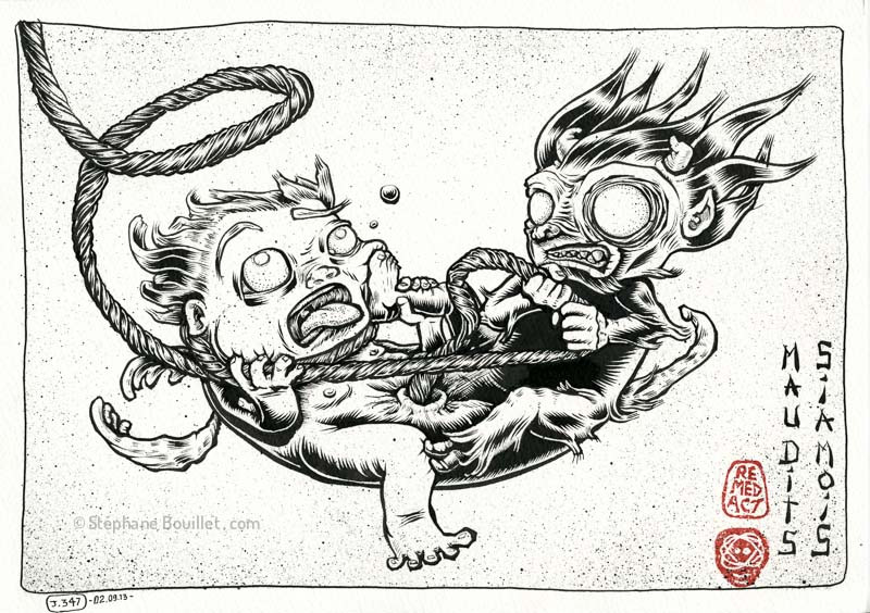 légende : des frères siamois s'entretue en essayant de s'étouffer avec le cordon ombilical. Il s'agit de Dieu et de Satan