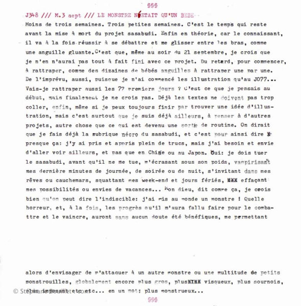 Moins de trois semaines. Trois petites semaines. C'est le temps qui reste avant la mise à mort du projet sasabudi. Enfin en théorie, car le connaissant, il va à la fois réussir à se débattre et me glisser entre les bras, comme une anguille gluante. C'est que, même au soir du 21 septembre, je crois que je n'en n'aurai pas tout à fait fini avec ce projet. Du retard, pour commencer, à rattraper, comme des dizaines de bébés anguilles à rattraper une par une. De l'imprévu, aussi, puisque je n'ai commencé les illustration qu'au J077... Vais-je rattraper aussi les 77 premiers jours ? C'est ce que je pensais au début, mais finalement je ne crois pas. Déjà les textes ne doivent pas trop coller, enfin, même si je peux toujours finir par trouver une idée d'illustration, mais c'est surtout que je suis déjà ailleurs, à penser à d'autres projets, autre chose que ce qui est devenu une sorte de routine. On dirait que je fais déjà la rubrique nécro du sasabudi, et c'est pour ainsi dire presque ça: j'y ai pris et appris plein de trucs, mais j'ai besoin et envie d'aller voir ailleurs, et pas que en Chine ou au Japon. Oui: je dois tuer le sasabudi, avant qu'il ne me tue, m'écrasant sous son poids, vampirisant mes dernière minutes de journée, de soirée ou de nuit, s'invitant dans mes rêves ou cauchemars, squattant mes week-end et jours fériés, effaçant mes possibilités ou envies de vacances... Mon dieu, dit comme ça, je crois bien qu'on peut dire l’indicible: j'ai mis au monde un monstre ! Quelle horreur, et, à la fois , les progrès qu'il m'aura fallu faire pour le combattre et le vaincre, auront sans aucun doute été bénéfiques, me permettant alors d'envisager de m'attaquer à un autre monstre ou une multitude de petits monstrouilles, globalement encore plus gros, plus visqueux, plus sournois, plus imposant etc etc... en un mot : plus monstrueux...