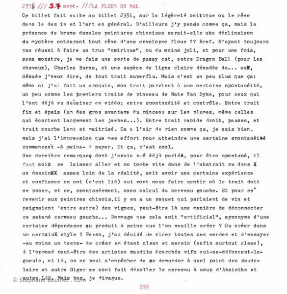 Ce billet fait suite au billet J351, sur la légèreté onirique ou le rêve dans le dessin et l'art en général. D'ailleurs j'y pense comme ça, mais la présence de brume dans les peintures chinoises serait-elle une déclinaison au mystère entourant tout rêve d'une enveloppe floue ?? Bref. N'ayant toujours pas réussi à faire un truc "onirique", ou du moins joli, et pour une fois, sans monstre, je me fais une sorte de pussy cat, entre Dragon Ball (pour les cheveux), Charles Burns, et une espèce de ligne claire dénudée de... euh, dénuée j'veux dire, de tout trait superflu. Mais c'est un peu plus que ça: même si j'ai fait un croquis, mon trait parvient à une certaine spontanéité, un peu comme les premiers traits de pinceau de Nate Van Dyke, pour ceux qui l'ont déjà vu dessiner en vidéo; entre spontanéité et contrôle. Entre trait fin et épais (un des gros avantage du pinceau sur les plumes, même celles qui écartent largement les jambes...). Entre trait rapide droit, pauses, et trait courbe lent et maîtrisé. Ça a l'air de rien comme ça, je sais bien, mais j'ai l'impression que mes efforts pour atteindre une certaine spontanéité commencent -à peine- à payer. Et ça, c'est cool. Une dernière remarque dont j'avais p-ê déjà parlé: pour être spontané, il faut soit se laisser aller et on tombe vite dans de l'abstrait ou dans un dessin assez loin de la réalité, soit avoir une certaine expérience et confiance en soi (c'est lié) qui vont nous faire sentir où le trait doit se poser, et ce, spontanément, sans calcul du cerveau gauche. Et pour en revenir aux peintres chinois,il y en a un paquet qui parlaient de vin et peignaient (entre autre) des vignes, peut-être là une manière de déconnecter ce satané cerveau gauche... Dommage que cela soit "artificiel", synonyme d'une certaine dépendance au produit à chaque fois que l'on veuille créer ? Ou créer dans un certain style ? Perso, j'ai décidé de virer toutes ces merdes et d'essayer -au moins un temps- de créer en étant clean et serein (enfin surtout clean), à l'opposé peut-être des artistes maudits écorchés vifs qui-se-défoncent-la-gueule, et là, on ne peut s'empêcher de se demander à quel point des Baudelaire et autre Giger se sont fait décoller le cerveau à coup d'Absinthe et autre LSD. Mais bon, je divague.