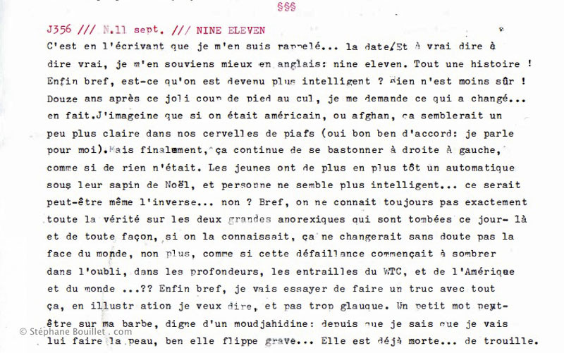 C'est en l'écrivant que je m'en suis rappelé... la date. Et à vrai dire à dire vrai, je m'en souviens mieux en anglais: nine eleven. Tout une histoire ! Enfin bref, est-ce qu'on est devenu plus intelligent ? Rien n'est moins sûr ! Douze ans après ce joli coup de pied au cul, je me demande ce qui a changé... en fait. J’imagine que si on était américain, ou afghan, ça semblerait un peu plus claire dans nos cervelles de piafs (oui bon ben d'accord: je parle pour moi). Mais finalement, ça continue de se bastonner à droite à gauche, comme si de rien n'était. Les jeunes ont de plus en plus tôt un automatique sous leur sapin de Noël, et personne ne semble plus intelligent qu'avant... ce serait peut-être même l'inverse... non ? Bref, on ne connaît toujours pas exactement toute la vérité sur les deux grandes anorexiques qui sont tombées ce jour-là et de toute façon, si on la connaissait, ça ne changerait sans doute pas la face du monde, non plus, comme si cette défaillance commençait à sombrer (dans l'oubli, dans les profondeurs, les entrailles du WTC, et de l'Amêrique et du monde... ?? Enfin bref, je vais essayer de faire un truc avec tout ça, en illustration je veux dire, et pas trop glauque. Un petit mot peut-être sur ma barbe, digne d'un moudjahidine: depuis que je sais que je vais lui faire la peau, ben elle flippe grave... Elle est déjà morte... de trouille.