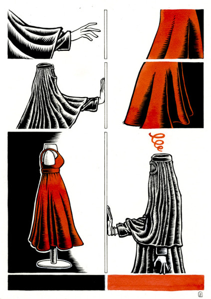 Adaptation BD de "Kant et la petite robe rouge", de Lamia Berrada-Berca. Essai rapide de couverture. "Voir sans être vue. Absence de soi aux autres. La burqa. Ce voile épais couvrant le corps de mille et une femmes est-il rempart ou prison ?" En une langue lumineuse, à fleur d'âme, Lamia Berrada-Berca sonde les pensées intimes d'une épouse cloîtrée en quête d'elle-même. Dans "Kant et la petite robe rouge", le désir féminin affronte la culture d'origine. Inattendus, un vêtement rouge sensuel et un texte fondateur insufflent la liberté à l'héroïne.