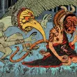 Cette illustration représente un karasu tengu à masque d'oiseau et un Nue à masque de singe (tous deux des yokais, créatures du folkore japonais), sous les trait d'une jolie geisha dont on voit le sein nu et le tatouage. Elle a une queue de singe, tient une tasse de saké et observe des orchidées Orchis simia (singe) alors que le Karasu tengu déploie ses ailes.