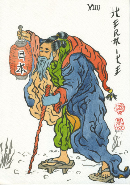 L'hermite japonais - carte VIIII du jeu de tarot Adptation libre de la lame majeur n°5, "l'hermite" du jeu de Tarot de Marseille, dans un style japonais.