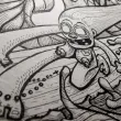 Lili la zombie surfe sur la barbe du dieu des mers Poséidon, armé de son trident. Sa barbe est comme une vague qui se détache en gouttelettes d'eau. Lili est une femme nue, ayant juste son chapelet comme bracelet de cheville et son tatouage de cœur sur le sein. Un poulpe est accroché dans ses cheveux et entraîné dans sa course folle, tenant lui-même un poisson dans ses tentacules, qui en a perdu la mouche qu'il venait de gober.