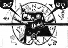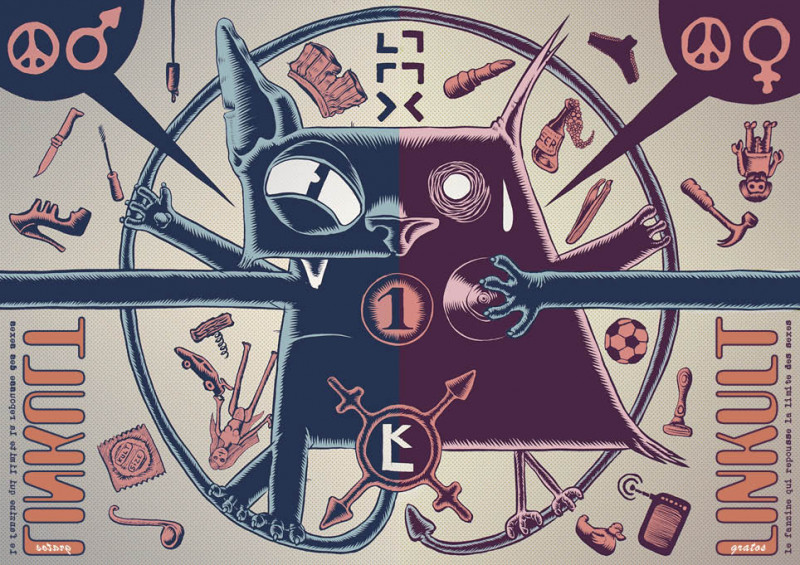 Couverture du fanzine Linkult#1, spécial relation homme / femme. Cette couverture reprend les deux mascottes du fanzine Mao le chat et Q.I. le canari, en leur associant des objet typiquement masculins ou féminins. Linkult est un fanzine développé par et pour des jeunes du Haut-Béarn: Oloron Sainte Marie et ses vallées alentour. Illustration + mise en couleur + mise en page par Stéphane Bouillet (Remedact)