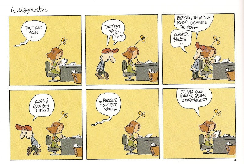 Manu Larcenet a fait ses armes chez Fluide Glacial aux début des années 90, véritable formation accélérée. C'est l'époque de Bill Baroud et de la possibilité de vivre de la Bande dessinée, sans s'encombrer de graphisme ou du coté commercial ou publicitaire de certaines illustrations... L'humour permet de parler de sujets qui ne prête pas à rire, et c'est justement là qu'il fonctionne bien.
