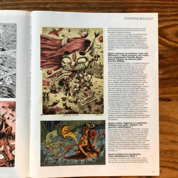 faites sous Clip Studio Paint (sinon, c’est à l’aquarelle) que j’utilise aussi pour mes croquis et gestion de pages en bande dessinée. La Jungle maudite est presque entièrement numérique et réalisée sur iPad. Je travaille sous Mac depuis des années, mets en page avec InDesign. J’ai depuis remplacé l’iPad par une Cintiq 24”, mais me tâte pour revenir au tout traditionnel (fatigue des yeux, consommation énergétique, éternels retours en arrière...).