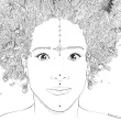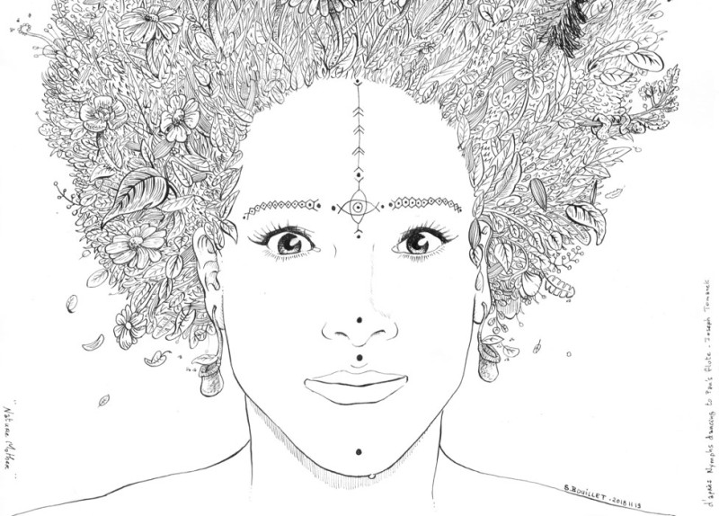 Portrait d'une femme tatouée dont les cheveux sont une multitude de plantes, se terminant par une forêt de sapins à son sommet, dans laquelle dansent des sorcières ou des nymphes nues autour d'un feu, lors d'une nuit de pleine lune.